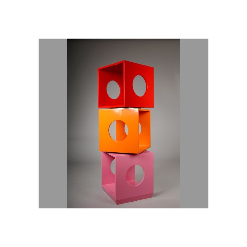 Äußerst verspielte und geniale Form für dieses Designer-Regal, das aus drei Würfeln besteht, die sich um eine Achse drehen.