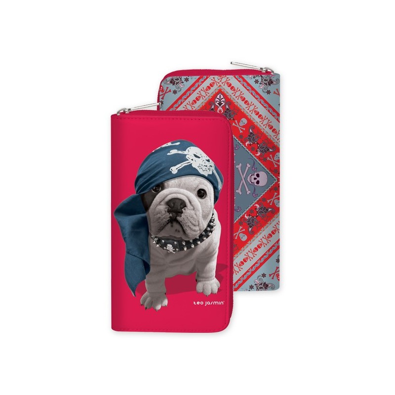 Teo on the front, pattern on the back Zipper on the upper side Central purse, 2 large pockets, 16 slots for credit cards, 4 large accordion pockets PVC exterior Polyester lining 20 x10 x 2 cm