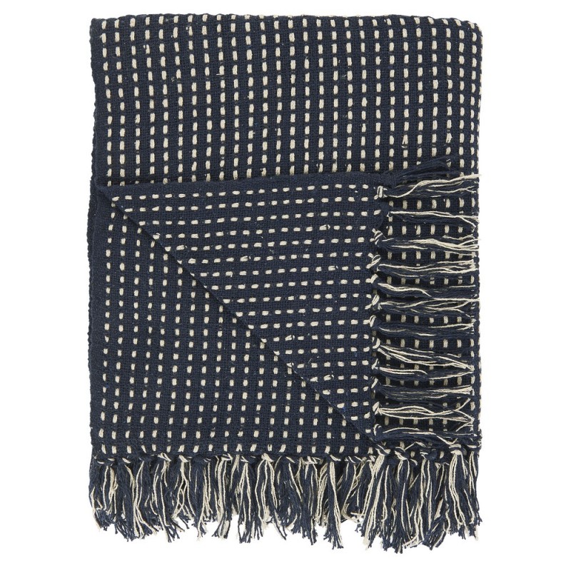 ib laursen plaid bleu fonce coton franges 130 x 160 cm