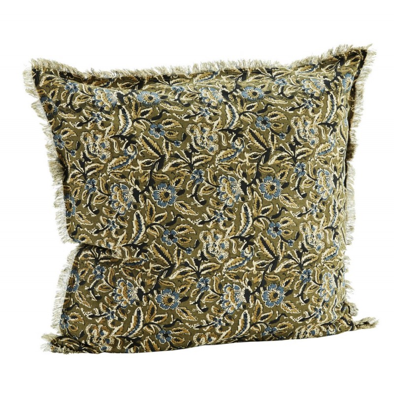 madam stoltz coussin carre franges coton imprime fleuri vert