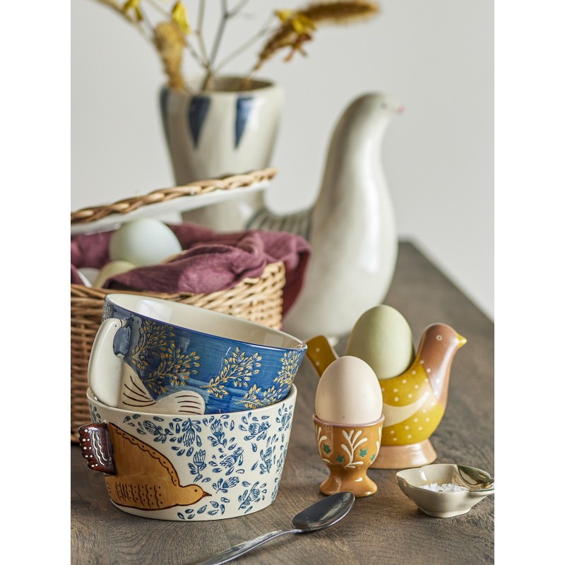 Composé de deux coquetiers en forme de petits oiseaux, cet ensemble en grès peint à la main apportera sourire et douceur à votre table.