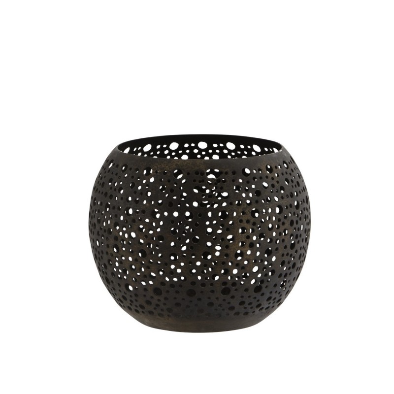 Sublimez vos soirées avec ce photophore en métal vieilli cuivré, signé Madam Stoltz, dont la forme ronde et ajourée laisse délicatement filtrer la lumière de la bougie.