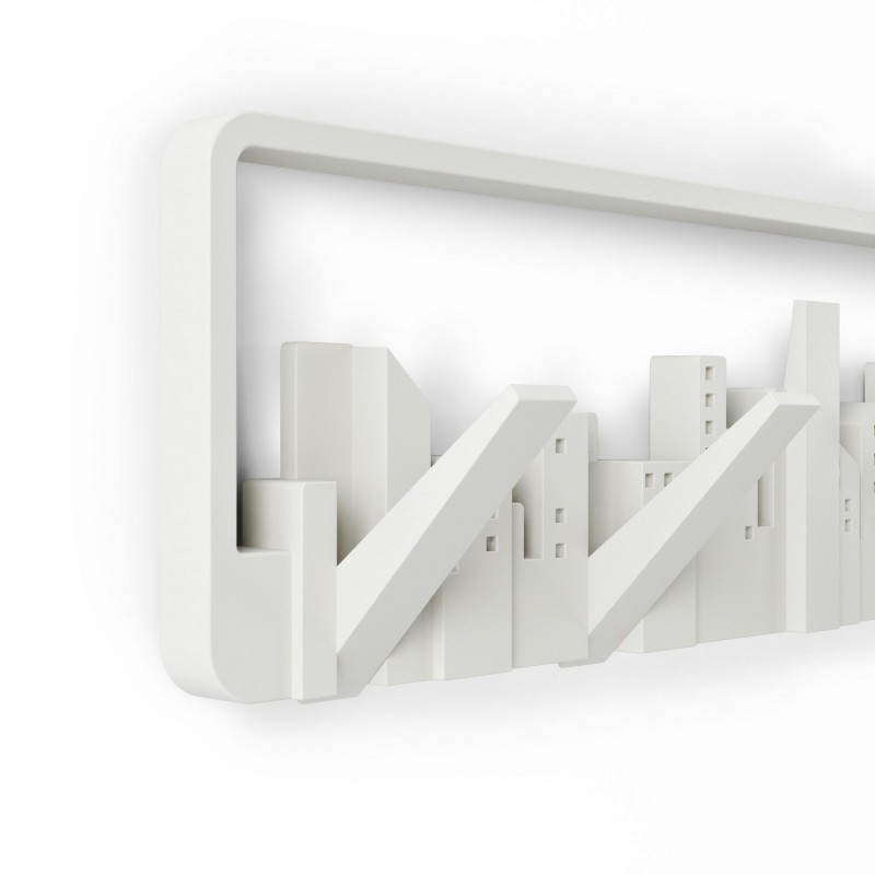 Portemanteau mural ultra original skyline umbra disposant de 5 crochets (supportant chacun jusqu'à 0,5 kg) que vous pouvez dissimuler tout simplement en le rabattant.