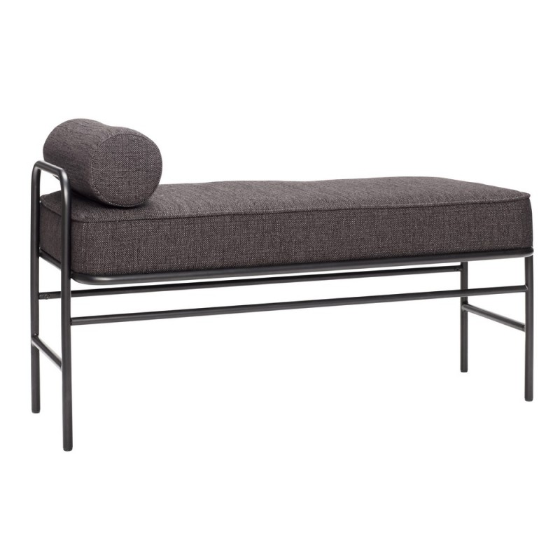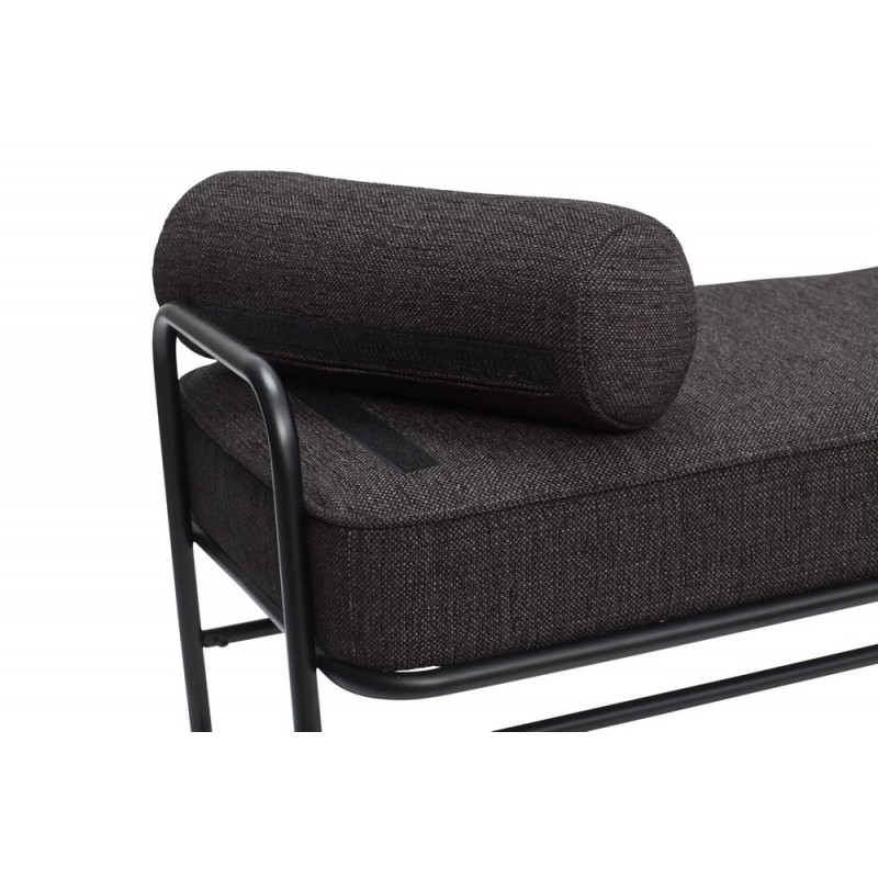 Métal noir, bois de pin, mousse, tissu polyester gris