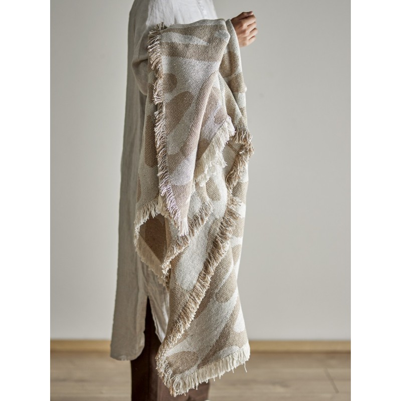 Confectionné en coton recyclé, il séduit par son motif organique subtil et ses franges délicates, qui apportent une finition élégante et texturée.