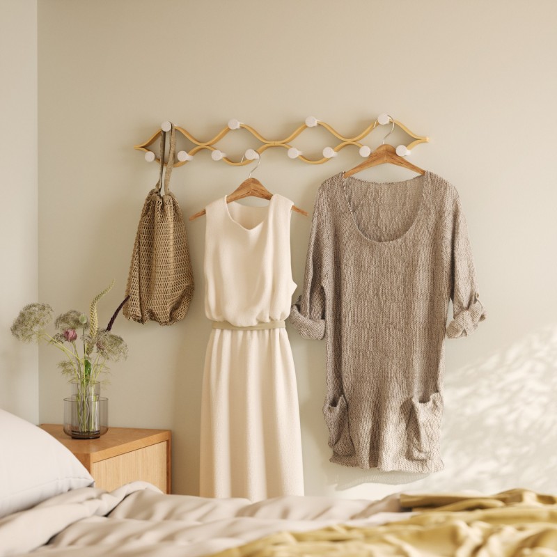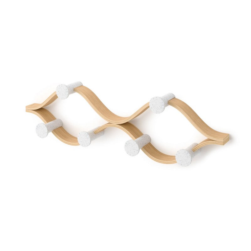Son design raffiné mêle le bois courbé clair à des patères blanches mates, pour un look à la fois moderne et sophistiqué.