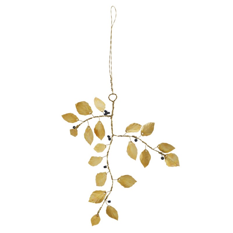 Réalisée en métal doré finition laiton, elle représente une branche délicate ornée de feuilles et de petites baies, suspendue par une ficelle dorée.