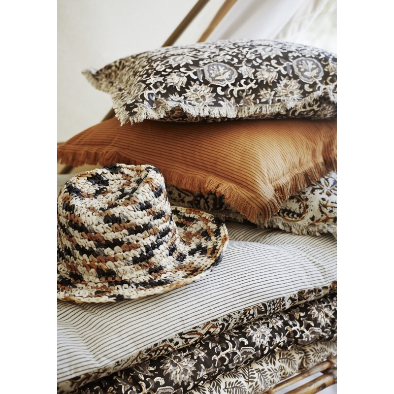 madam stoltz coussin imprime indien beige jaune gris franges